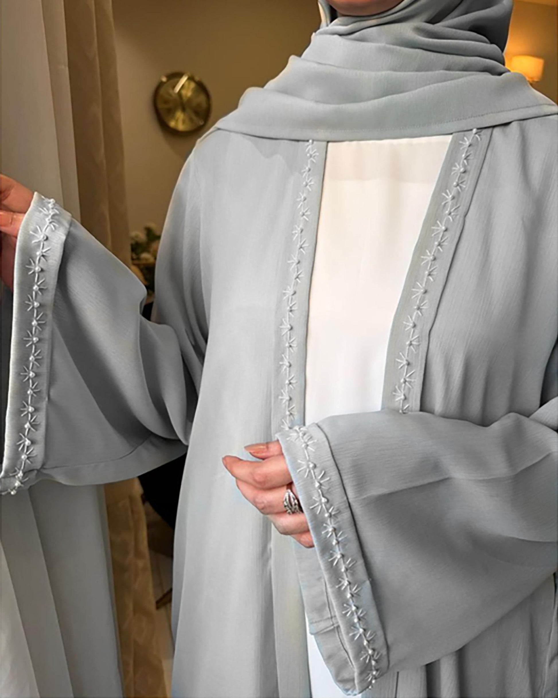 - Details: This elegant open-style abaya features a soft sage blue outer layer paired beautifully with a soft white inner panel for a refined contrast. Designed with delicate embellishment detailing along the front and sleeves, it adds a subtle touch of sophistication without overpowering the look.