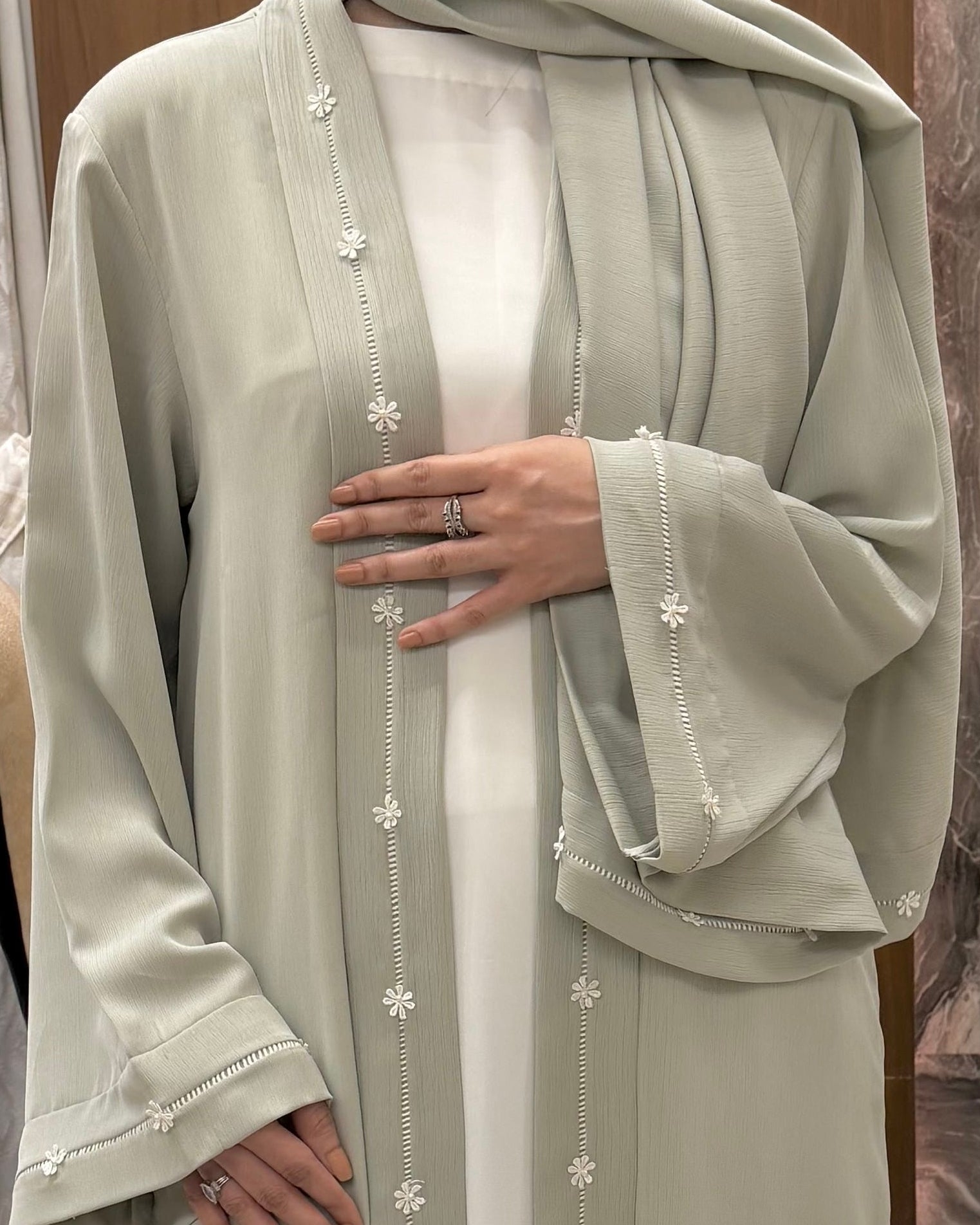 - Details: This graceful open-style abaya features a serene sage green outer layer paired with a soft ivory inner, creating a delicate and sophisticated contrast. The design is enhanced with subtle floral embellishments running along the front panels, adding an elegant handcrafted touch.