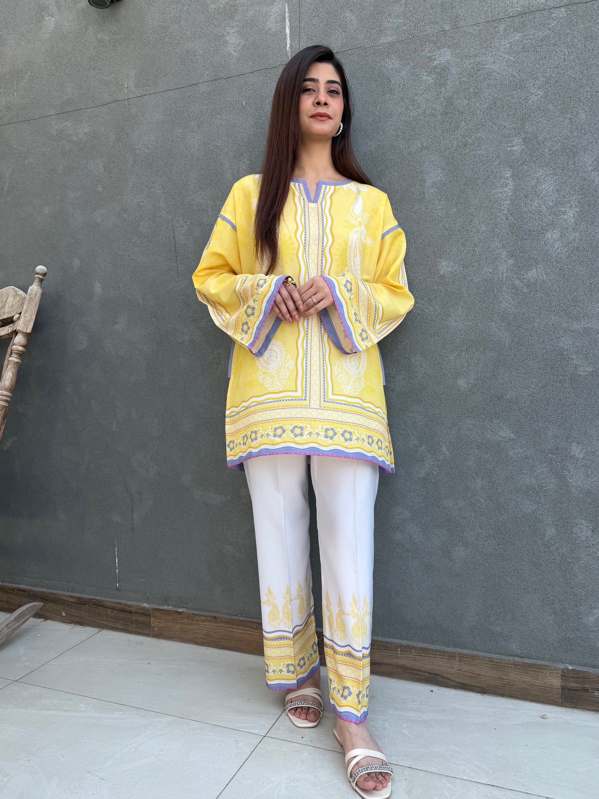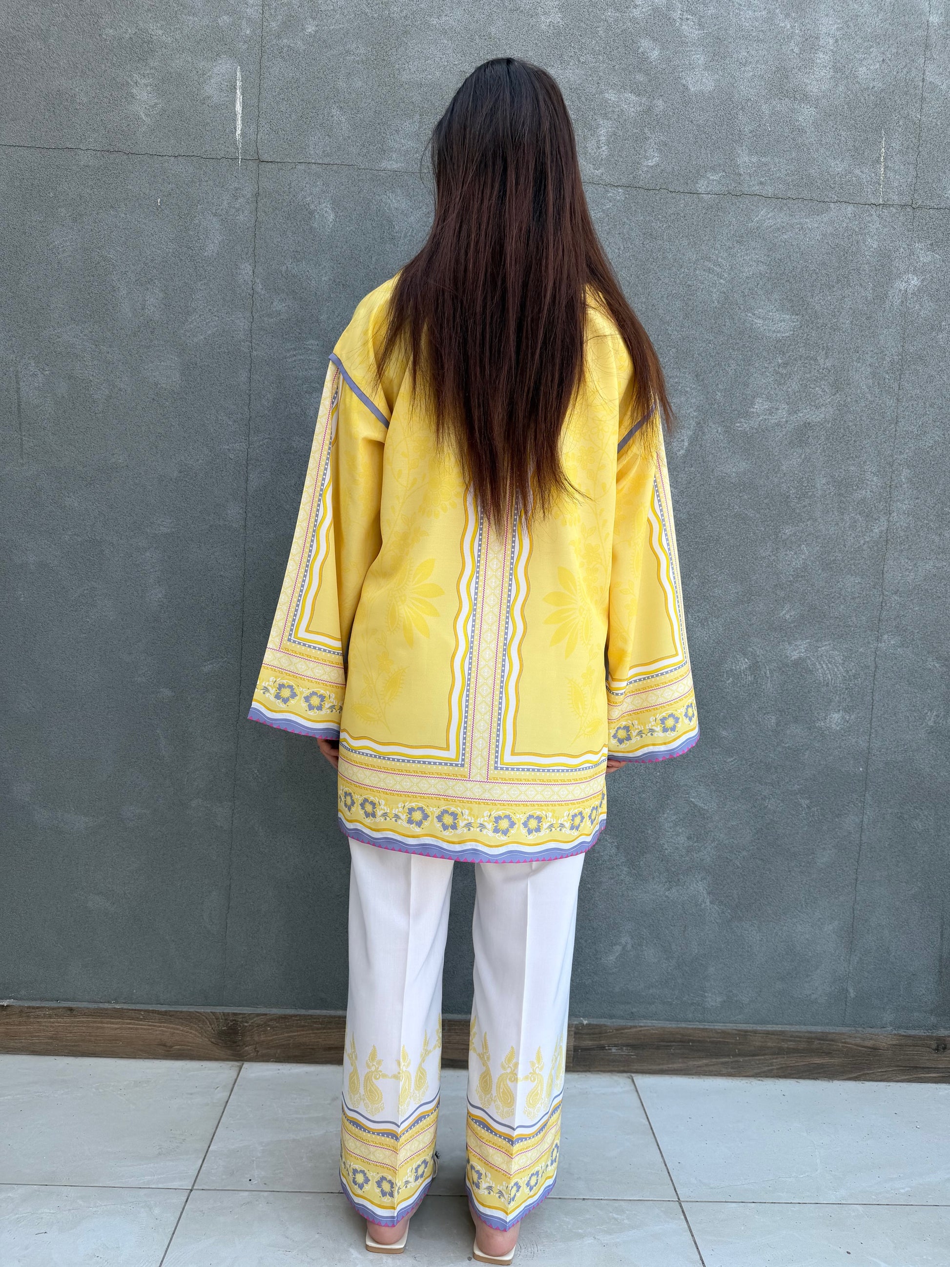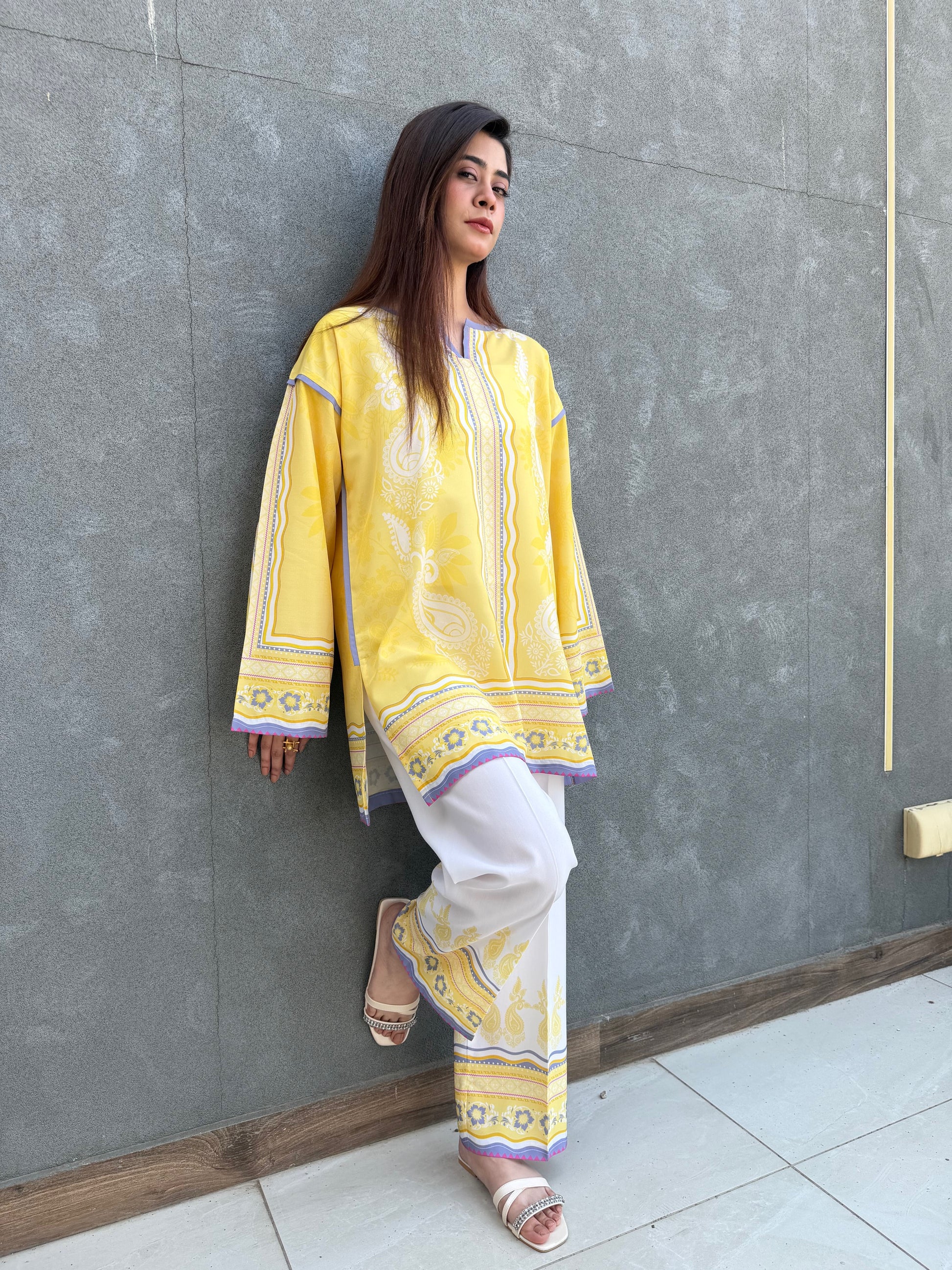 - Details: This refreshing two-piece co-ord set features a vibrant sunshine yellow shirt adorned with delicate paisley and floral-inspired prints in soft white and subtle lavender accents. The straight-cut silhouette is enhanced with a detailed vertical neckline panel and wide statement sleeves finished with coordinated borders. Paired with trousers featuring matching printed hems, the outfit creates a balanced and polished look. Crafted from breathable poly lawn fabric, it offers a lightweight feel and effortless comfort — perfect for summer days and casual gatherings.